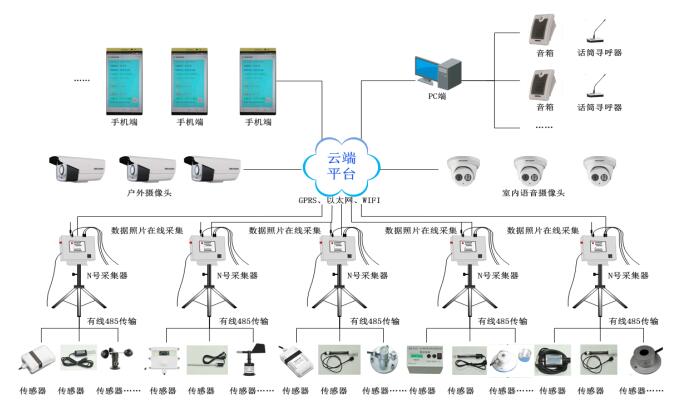 本系統主要由云平臺無線數劇采集器、傳感器、、視頻采集系統、圖片拍照系統、語音與視頻交互系統、云平臺組成。后臺數據處理系統及信息監(jiān)控管理云平臺、數據采集器、傳感器、視頻監(jiān)控系統、無線傳輸系統組成。監(jiān)測子站集成;數據平臺是一個互聯網架構的網絡化平臺,具有對各子站的監(jiān)控功能以及對數據的報警處理、記錄、查詢、統計、報表輸出等多種功能。