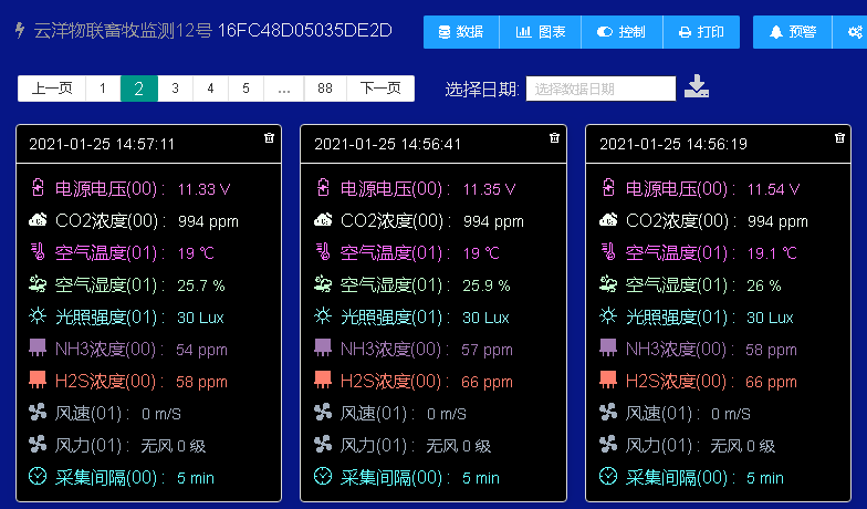 利用傳感器可以監(jiān)測養(yǎng)殖場內(nèi)外空氣清新度、PM1.0、PM2.5、PM10、TSP、GPS衛(wèi)星定位經(jīng)緯度、噪聲、空氣溫度、空氣濕度、NO2、O2、O3、H2S、CO、NH3、SO2、HCl、HF、Cl2、大氣壓力、風(fēng)速、風(fēng)向、雨雪傳感、光照強度、紫外輻射強度等項指標(biāo)。又可根據(jù)用戶需求定制其他測量要素。