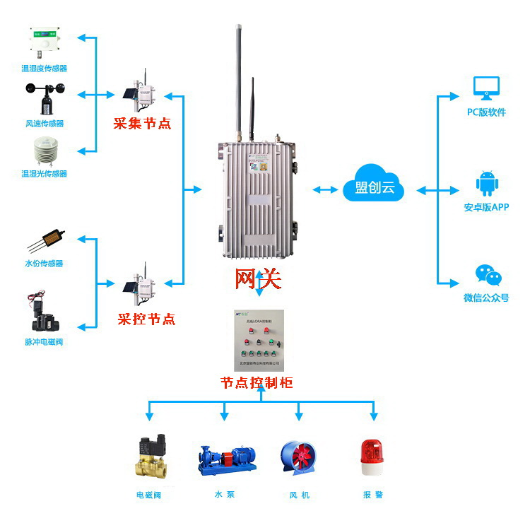 LoRa無線節(jié)點(diǎn)采集控制柜使用于,小型園區(qū)溫室、大田無通訊線,統(tǒng)一控制完成各種機(jī)電自動(dòng)化設(shè)備,卷簾、遮陽、風(fēng)機(jī)、電磁閥、水泵等。以LoRa無線傳輸模式與智能網(wǎng)關(guān)進(jìn)行通信。對(duì)傳感器采集、實(shí)現(xiàn)自動(dòng)化控制。