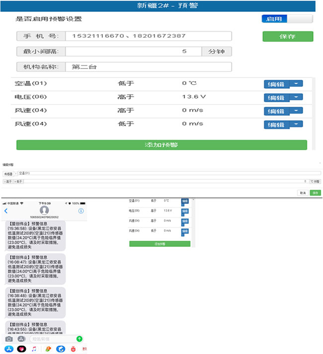 5、預(yù)警設(shè)置:?jiǎn)⒂妙A(yù)警設(shè)置并通過(guò)添加手機(jī)號(hào),短信推送了解何種氣象出現(xiàn)報(bào)警。可添加多個(gè)手機(jī)號(hào)多人來(lái)管理。傳感器設(shè)置:點(diǎn)擊編輯按鈕出現(xiàn)圖2,在圖2中根據(jù)實(shí)際情況設(shè)置各傳感器的預(yù)警值,并點(diǎn)擊保存即可。最后點(diǎn)擊添加預(yù)警按鈕,即為預(yù)警設(shè)置成功。詳見(jiàn)如下: