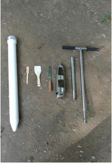 a. 取土鉆鉆頭、手柄、支桿,完成后將取土鉆豎直于地面,雙手緊握手柄順時(shí)針下壓慢速轉(zhuǎn)動(dòng)。(注意:不要太用力,務(wù)必慢速多轉(zhuǎn)幾圈,防止鉆頭跑偏至孔洞打歪)