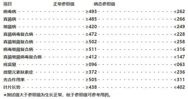 測試值為指導用藥參考值,測試數(shù)值越少表明作物病害越嚴重或植物長勢越弱,除用殺菌劑外應補施葉面肥,用量不能越過某種藥品的限量值,否則產(chǎn)生藥害。