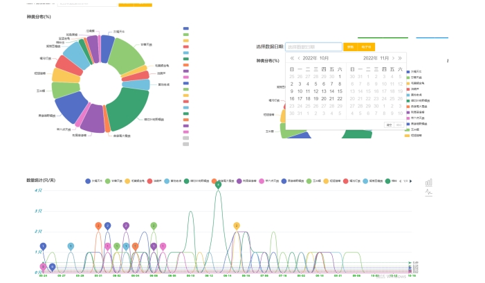 5、蟲害統(tǒng)計功能。針對不同品種害蟲識別結(jié)果歷史數(shù)據(jù),可選擇一定時間范圍內(nèi)數(shù)據(jù)查詢統(tǒng)計,通過圖表形式顯示。可選任意害蟲種類,直觀看出發(fā)生的蟲害種類和數(shù)量,從而判斷其危害程度。